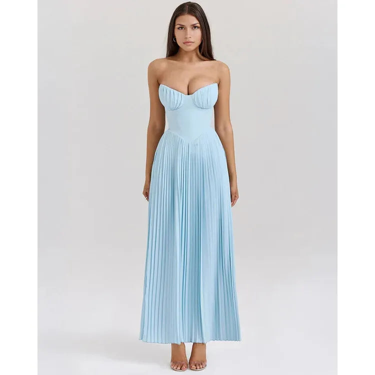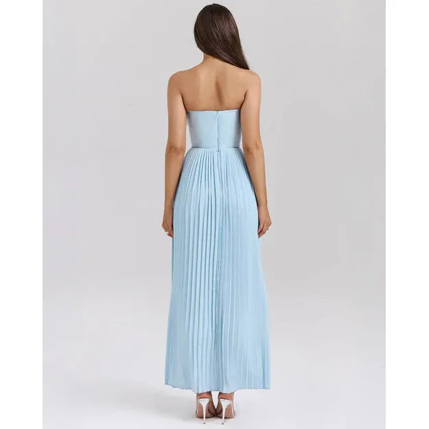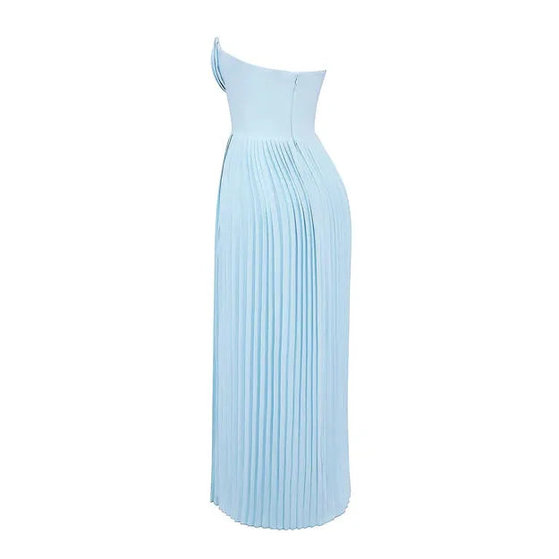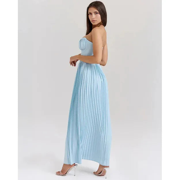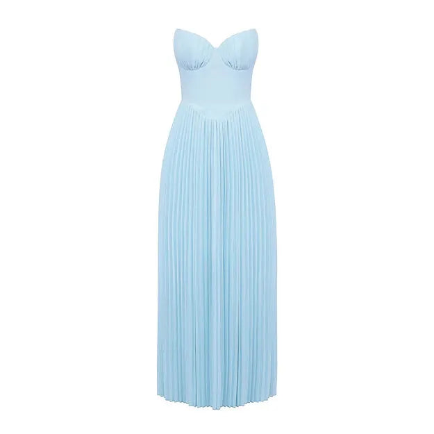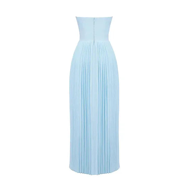 The ethereal oceanic beauty of Senna creates a dreamy and romantic feel. Cut from an ocean blue georgette, the bust features shell shaped pleats and beautifully define your décolletage. The bodice is perfectly boned to cinch the waist. The pleated maxi skirt flows elegantly, ensuring every step is truly mesmerising. Wear yours for those High Summer events and dinner dates.